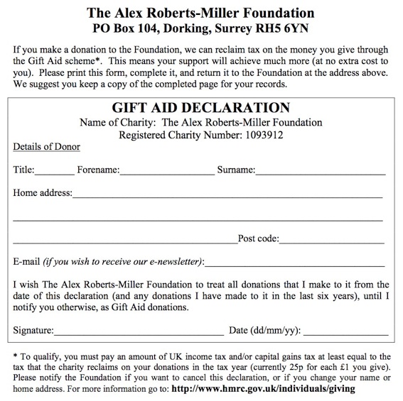 To donate by post, please make cheques payable to "The Alex Roberts-Miller Foundation" and send it to: The Alex Roberts-Miller Foundation, P.O. Box 104, Dorking, Surrey RH5 6YN.