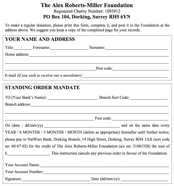 If you have online banking, you can make a direct transfer to The Alex Roberts-Miller Foundation at: a/c no: 31681328, NatWest Bank (Dorking UK branch) sort code no: 60-07-02. Please remember to include your name as a reference so that we know who sent it.